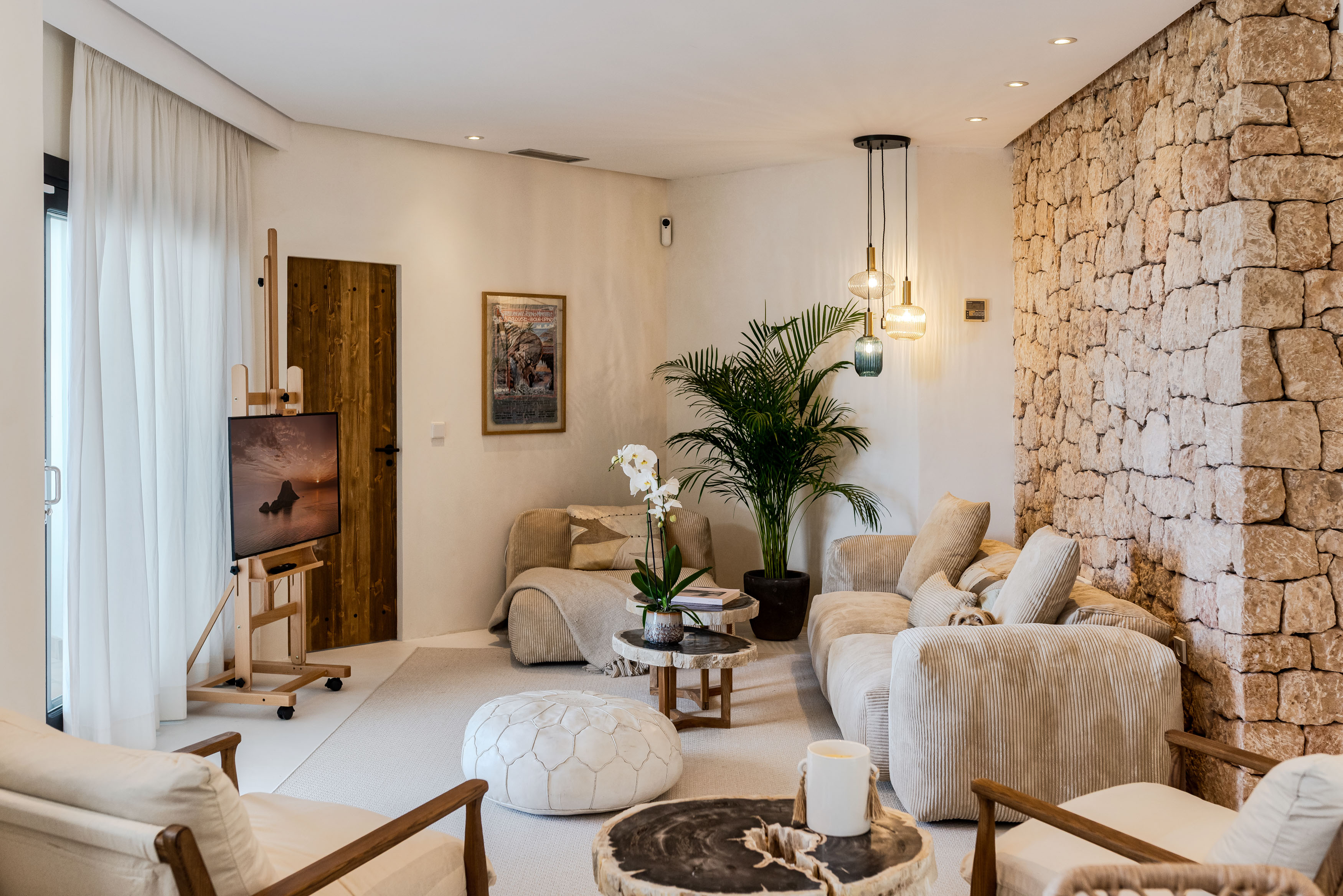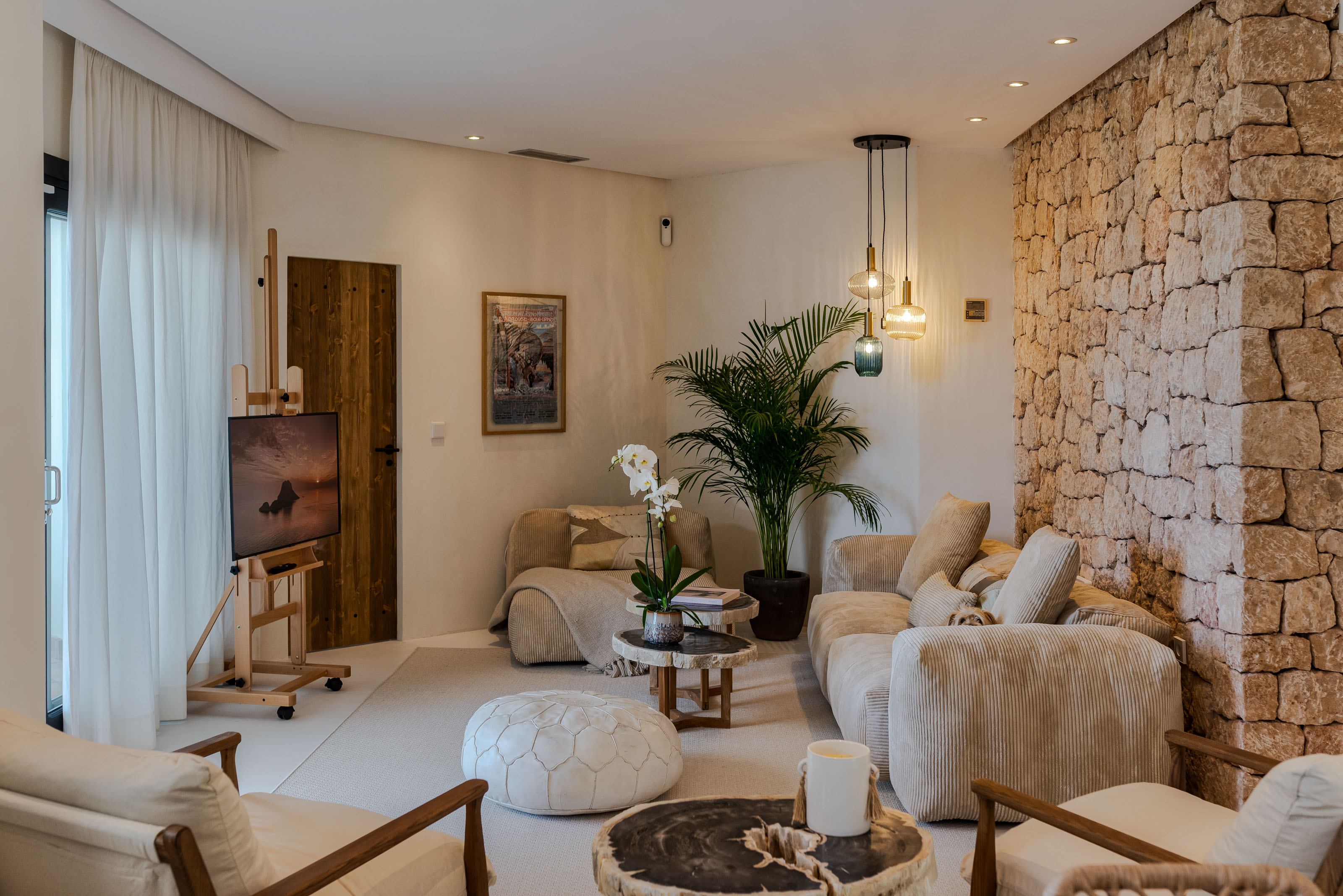 Located only five min driving distance to Calla Llentrisca this private villa features an amazing swimming pool and different chill out areas. It has 3 spacy room with queen bed and 3 bathrooms.