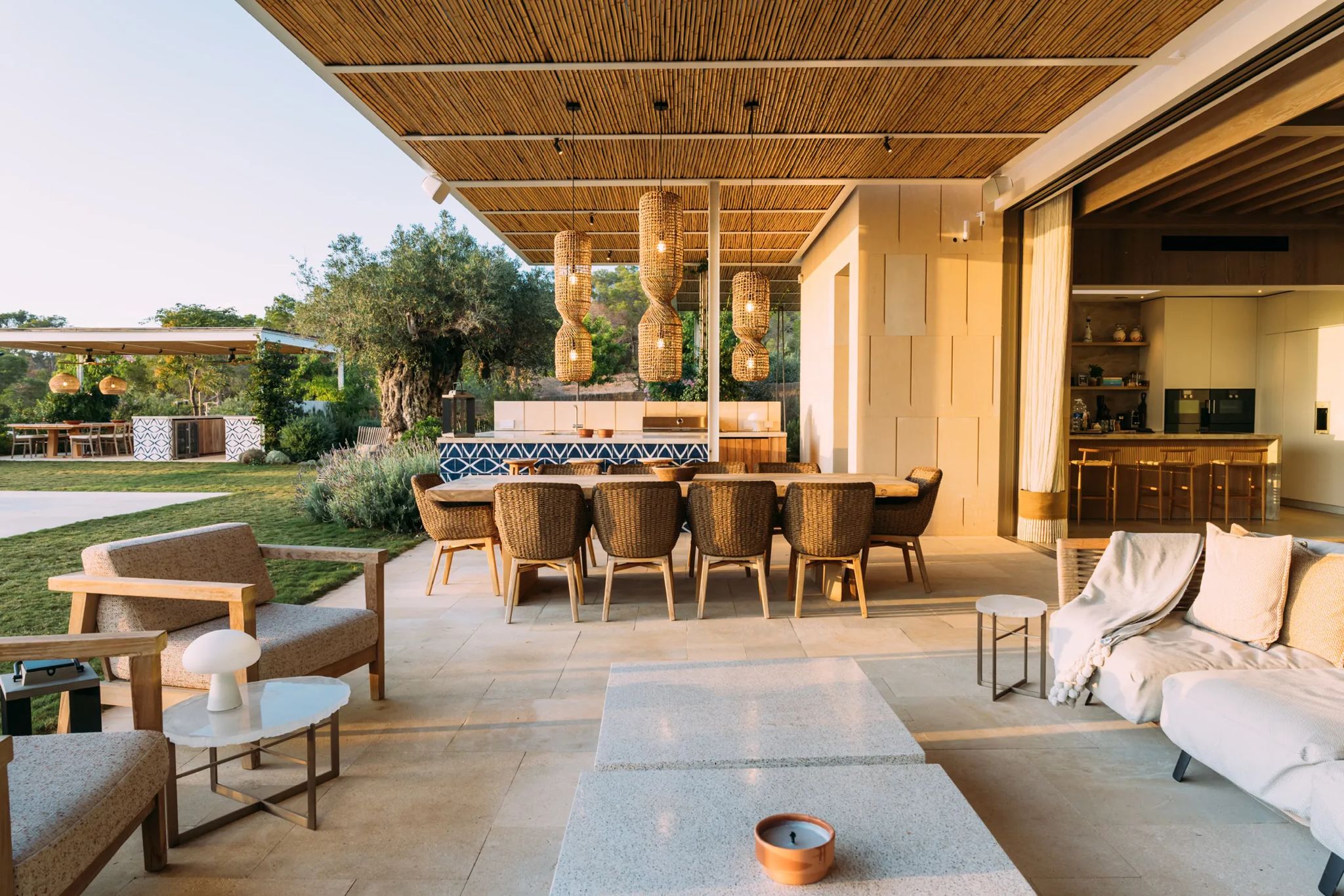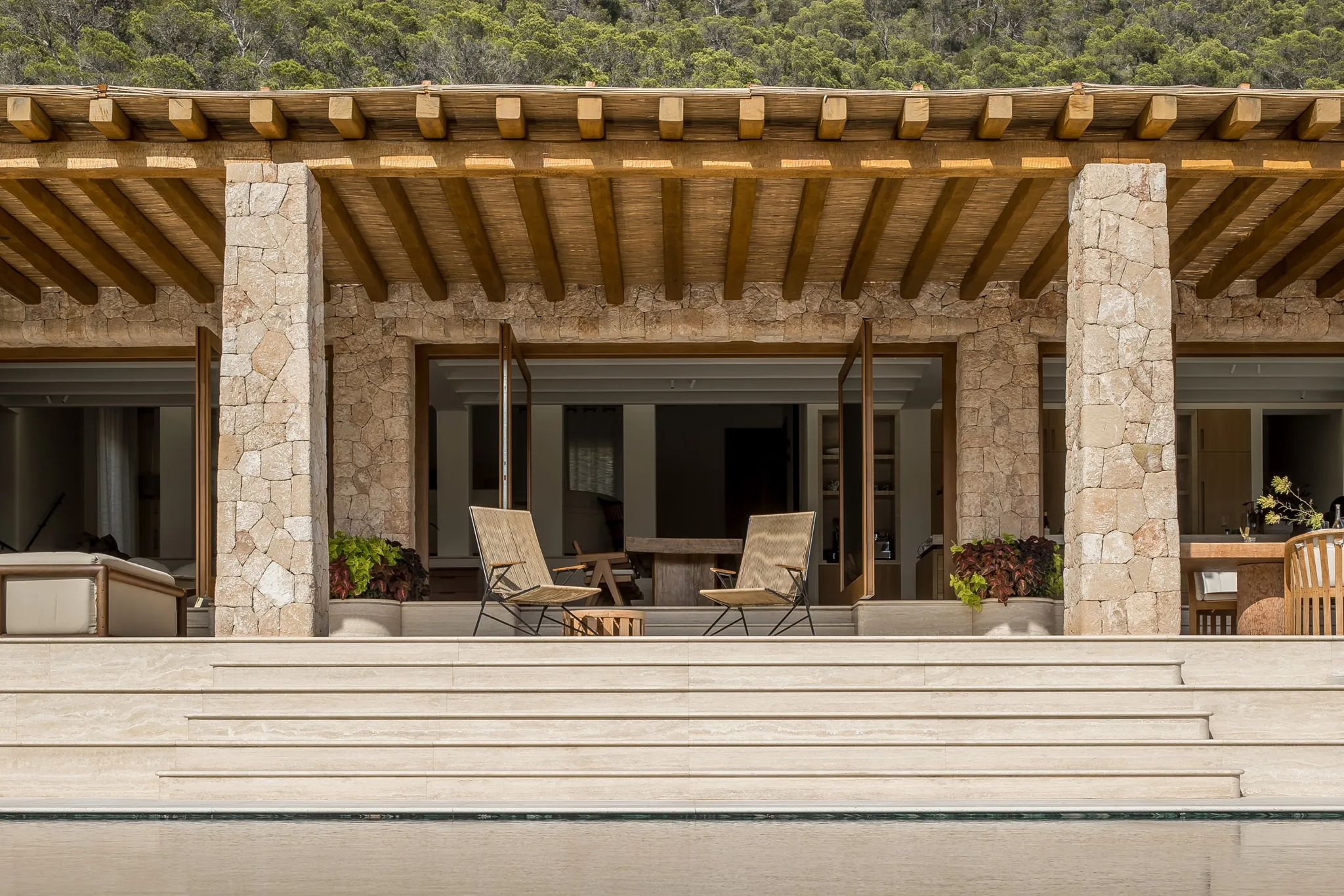 For sale: A luxurious six-bedroom villa perched on a hillside above Cala Mastella, surrounded by pine forests and offering distant sea views. Designed by Framework Studio, this property combines modern and traditional Ibicencan architecture, featuring an impressive stone façade. Its secluded location is enhanced by an off-grid energy system.